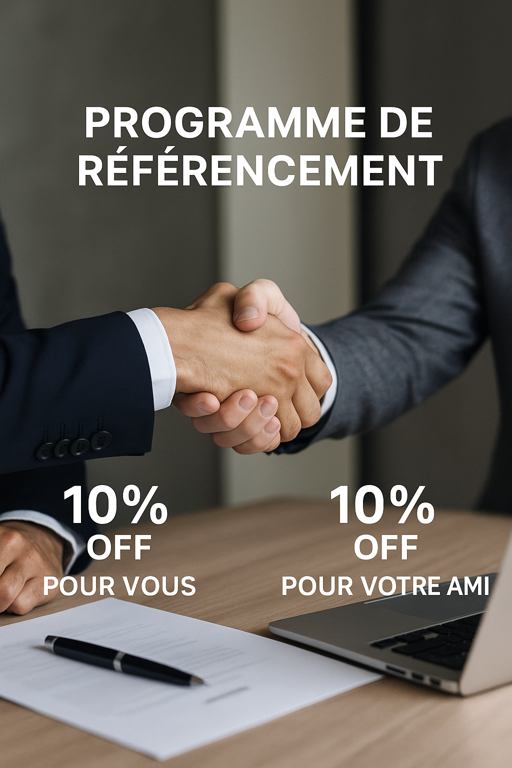 La remise de 10 % sera remise en argent (virement, chèque ou autre mode convenu), une fois que la facture du nouveau client est payée en totalité. Nous vous contacterons directement avec les instructions pour la réception de votre récompense.